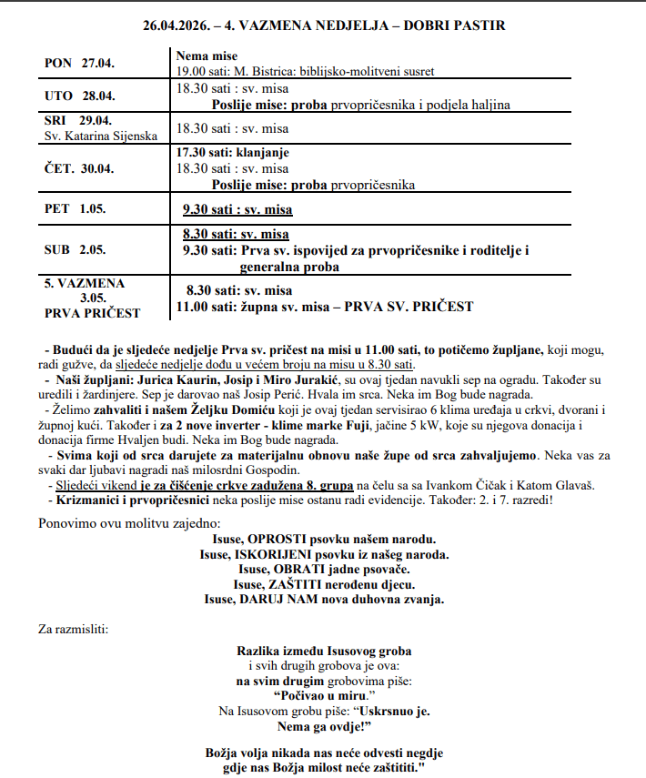 Krizmanici i prvopričesnici neka poslije mise ostanu radi evidencije. Također: 2. i 7. razredi!