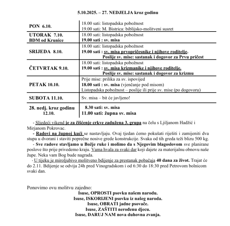 5.10.2025. – 27. NEDJELJA kroz godinu Sljedeći vikend je za čišćenje crkve zadužena 3. grupa na čelu s Ljiljanom Hadžić i Mirjanom Pokrovac. Radovi na