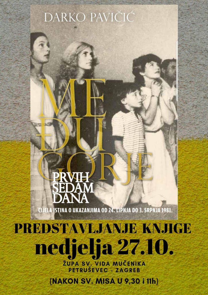 U nedjelju 27. listopada 2019. u našoj župi biti će predstavljanje knjige „Međugorje – Prvih sedam dana ukazanja“. Knjigu će predstaviti sam autor knjige gospodin Darko Pavičić. Predstavljanje knjige biti će nakon svetih misa u 9.30 i 11.00 sati.